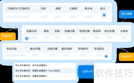 11、 考试结束后,系统自动完成阅卷评分,汇总各部门及考生的成绩数据,进行统计分析,生成分数、排名、最高分、最低分、平均分、通过率和参考率等详细信息。