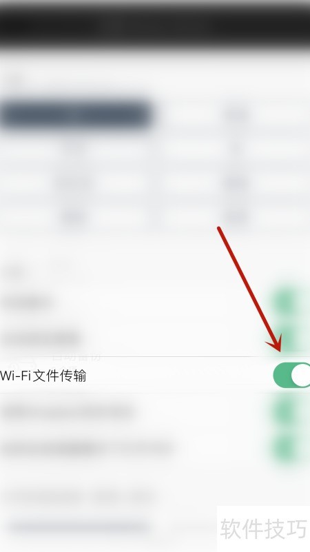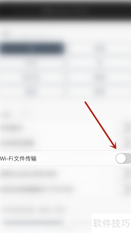 4、 在设置中找到Wi-Fi文件传输并点击其后的圆点开启功能。