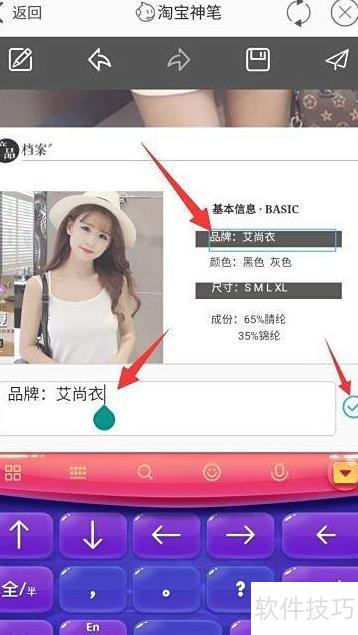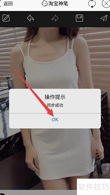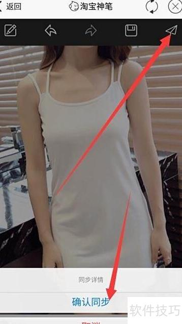 5、 第六步,全部修改完成后,点击右上角形似纸飞机的图标,选择底部的确认同步,稍等片刻显示同步成功后,点击确定即可。此后,顾客在手机淘宝上就能看到该商品整洁美观的页面了。