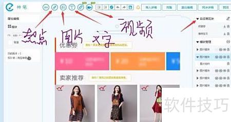 3、 在商品编辑页面,左侧为工具栏,右侧为模块管理区。若对新版神笔操作不熟练,可切换至老版。老版神笔功能更全面,支持添加热点区域。本次重点介绍老版使用方法,点击即可切换回旧版界面。