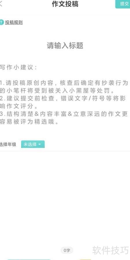 3、 在投稿页面填写标题,选择对应年级,撰写作文内容。写作前请先阅读页面中的建议,完成后点击右上角提交按钮即可完成投稿。