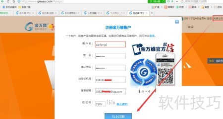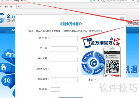 3、 访问金万维官网,点击免费注册,按提示在弹出页面中准确填写相关信息完成注册。