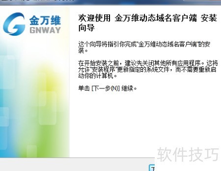 5、 请访问官网下载并安装金万维动态域名客户端,具体地址为:http://www.gnway.com/prod/gnhost/download.phtml。安装时只需依次点击下一步即可完成全部操作,详细步骤可参考附图说明。