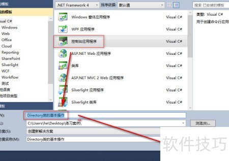 2、 选择控制台应用,将其命名为Directory类的基本操作,点击确定完成创建。