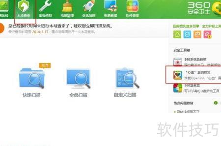 2、 点击木马查杀后,会出现心血漏洞修复选项,点击进入。通常需先联网下载并安装该功能组件,完成后即可进行修复操作。