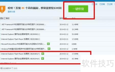 3、 启动程序后,系统将自动扫描计算机中存在的安全漏洞,所有检测结果均根据设备实际环境智能筛选。扫描结束后,按照界面提示点击即可完成处理。所示,检测结果显示存在Internet Explorer相关的漏洞。由于我使用的是IE10版本,因此发现的漏洞与黑客大赛中针对IE8的有所不同,但修复流程完全一致,操作简便,无需手动干预。