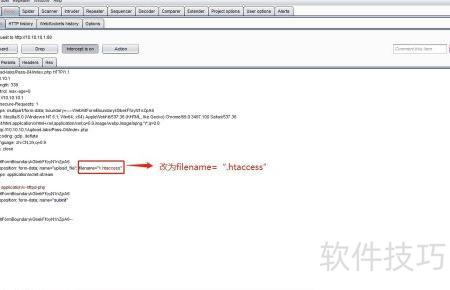 6、 上传名为1.htaccess的文件,利用Burp Suite将请求中的filename参数修改为.filename=.htaccess,以绕过服务器对文件名的检测机制,实现非法文件上传。