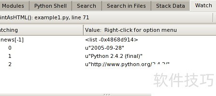18、 用户可在Watch面板中查看任意Python表达式,只需点击Watching列的空白区域,输入所需观察的表达式即可。