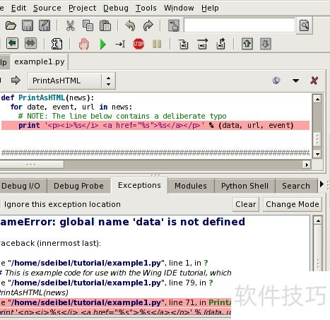 3、 Wing IDE 会在 PrintAsHTML 中标记错误代码行,并于异常工具中显示相应错误信息。