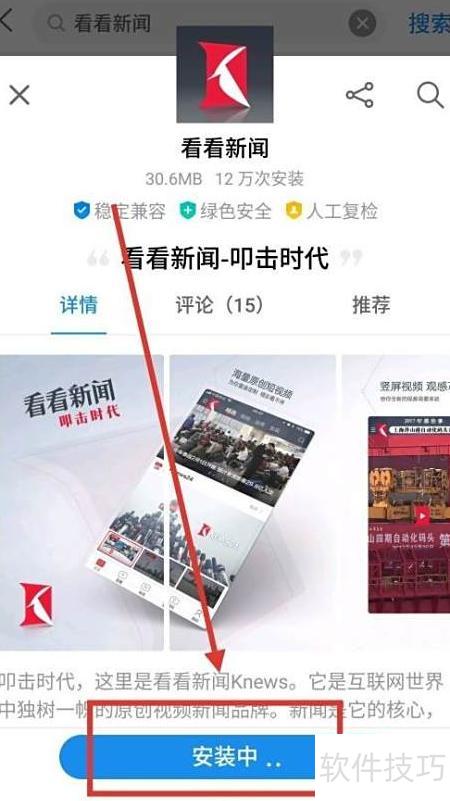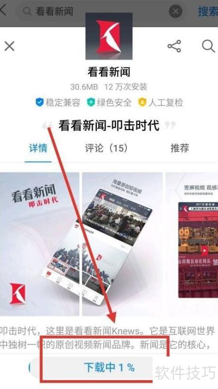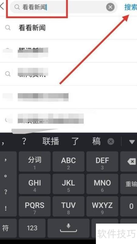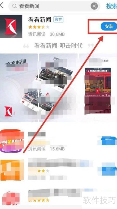 2、 进入应用商店后,在顶部搜索栏输入看看新闻,点击搜索按钮即可查找,具体操作所示。