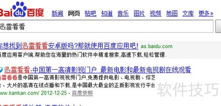 2、 在百度首页搜索迅雷看看,点击官网链接下载软件。
