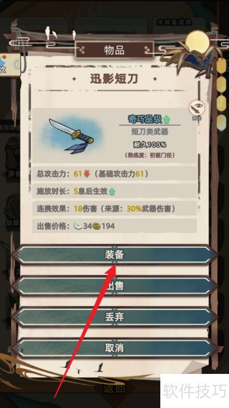 3、 点击装备按钮,选择迅影短刀进行装备。