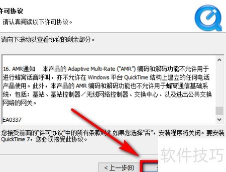 4、 与大多数软件相同,安装过程中会弹出协议界面,此类协议内容通常相似,可直接忽略。点击界面上标注的按钮继续(若选择否则安装将立即终止),随后进入下一安装步骤。