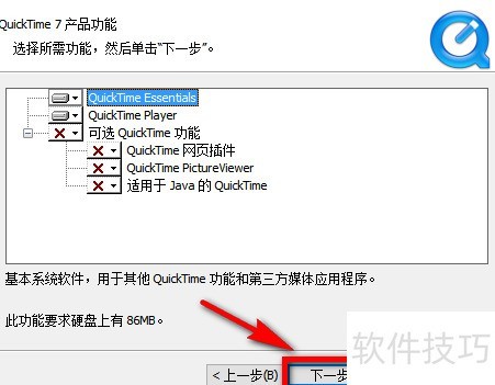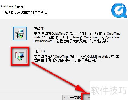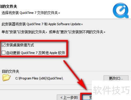 7、 安装程序跳转到该页面后,请根据个人需求,在图示位置选择是否勾选创建桌面快捷方式和自动更新QuickTime及其他Apple软件。确认选项无误后,点击页面下方的下一步继续安装流程。