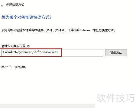 3、 在输入框内键入 %windir%system32perfmon.exe /res,随后点击下一步按钮继续操作。