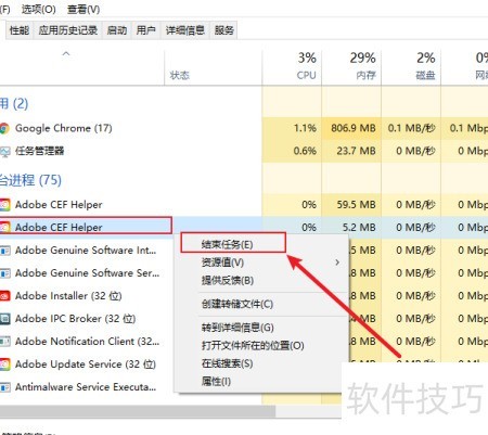 6、 右键进程,选择结束任务即可。