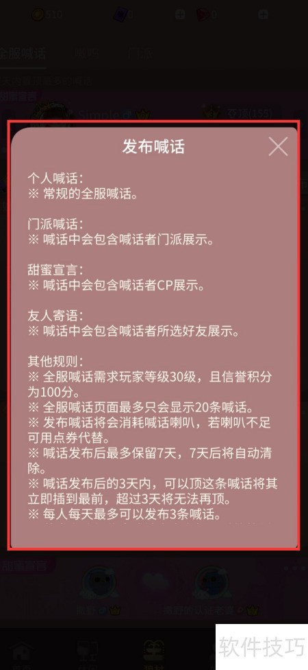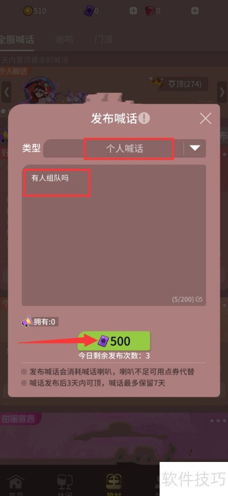 3、 选择类型并填写内容,支付500点券即可完成喊话。