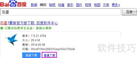1、 以迅雷为例,百度搜索后选择普通下载并点击。