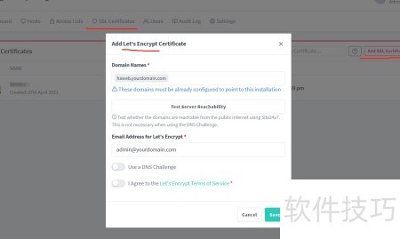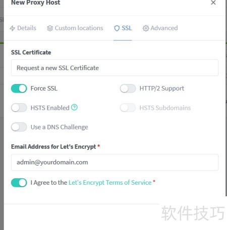 20、 在Nginx Proxy Manager中配置域名时,将SSL证书设为自动模式,即可完成HTTPS访问的启用设置。