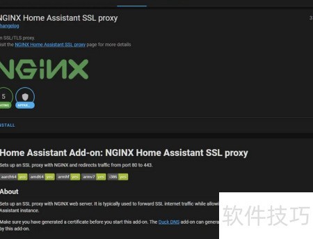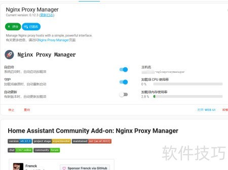 6、 进入配置页面的加载项商店,搜索并安装Nginx Proxy Manager,启动后检查日志。若出现数据库相关错误,可先安装MariaDB加载项,完成相应参数设置后再重试,确保服务正常运行。
