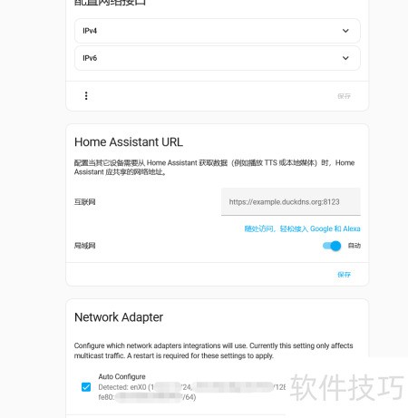 3、 实现域名访问的方法有多种,例如可在Home Assistant控制台的配置-系统-网络中设置Home Assistant URL(访问时需包含端口)。