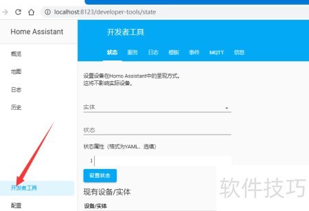 1、 在Home Assistant界面左侧选择开发者工具,可查看设备状态及监听相关事件。