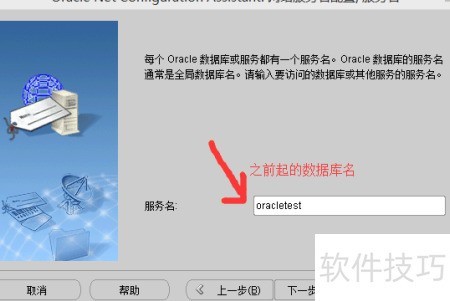 3、 在服务名处填写配置数据库助手时设定的数据库名称,然后点击下一步继续操作。