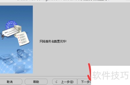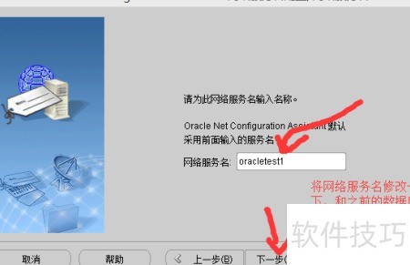9、 接下来将弹出网络服务名输入框,默认显示先前填写的数据库名称,需稍作调整,确保与原名称不同,修改完毕后点击下一步。
