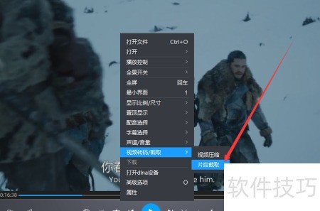 2、 右键点击视频播放区域,从菜单中选择视频转码/截取,再进入片段截取功能,操作所示。