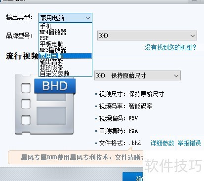 4、 暴风转码安装完毕后,程序将自动打开主界面并弹出输出格式选择窗口。选择家用电脑作为输出类型,保留默认的BHD格式,确认无误后,点击底部的确定按钮继续下一步操作。