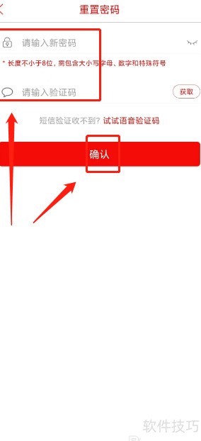 4、 进入密码重置页面,填写新密码和验证码后点击确认。