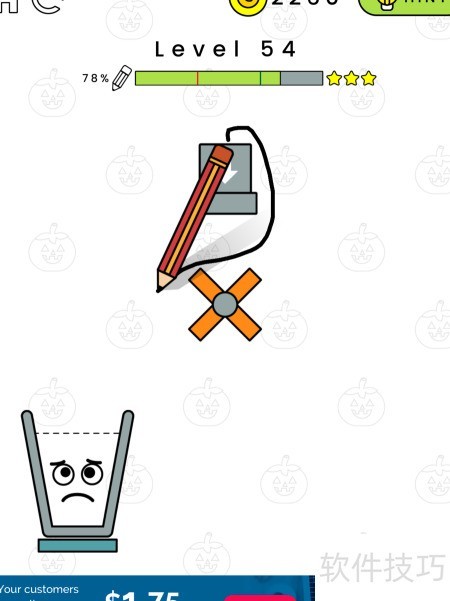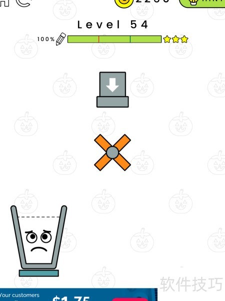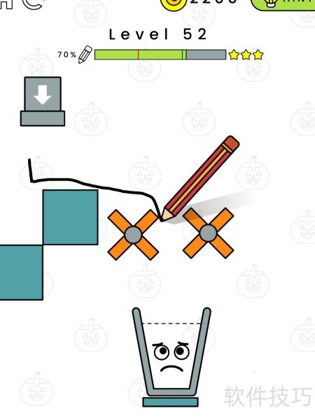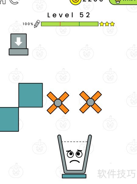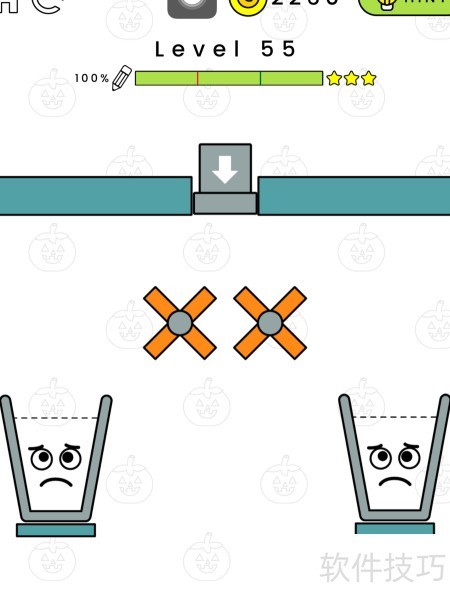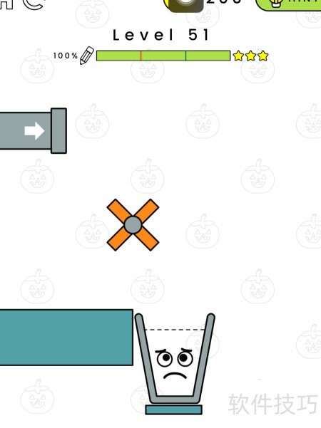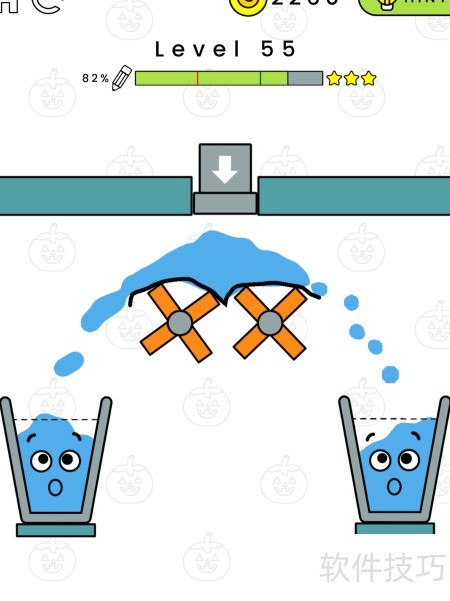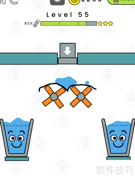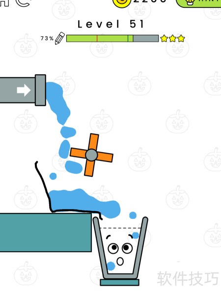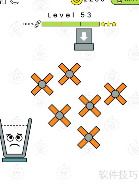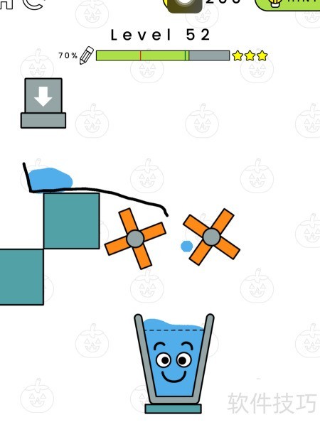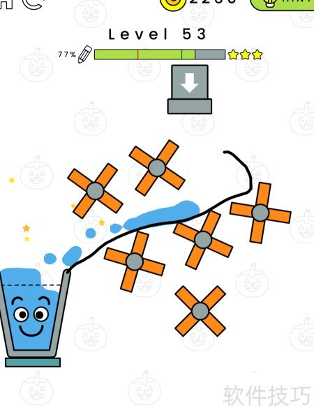 3、 第53关需绕开风车,从底部引水入杯,靠近杯口时控制线条长度,避免水流溢出。