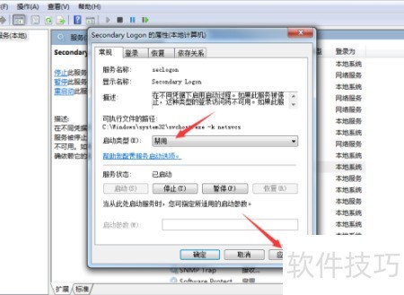 5、 在Secondary Logon 的属性窗口中,将启动类型设为禁用,然后点击应用按钮确认设置,具体操作所示。