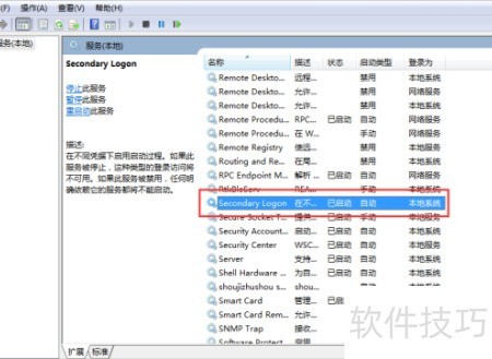 4、 在服务对话框的右侧区域,定位到Secondary Logon项,双击左键打开其属性设置窗口,具体操作所示。