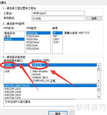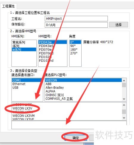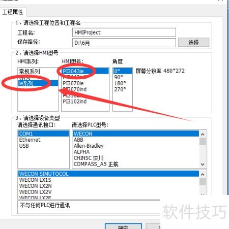 5、 根据步骤①确定的触摸屏型号,在新建工程时于HMI型号选项中选取对应系列与具体型号。