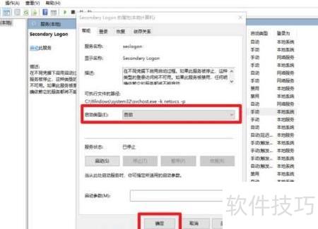 3、 在本地计算机的Secondary Logon属性窗口中,将启动类型设为自动,点击启动按钮,确认后重启电脑,即可成功启用Secondary Logon服务。