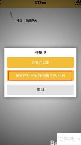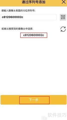 14、 点击软件左上角的返回箭头,退回到主菜单界面。依次选择安装摄像头或添加一台摄像头,进入后选择通过序列号添加(摄像头已上线),找到并选中C8这一串字符,随后点击下一步,按照提示操作直至添加完成。
