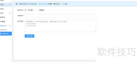 10、 手动输入时,可直接批量复制手机号并设置分组名称;选择文件导入时,请按规范下载或填写模板后上传,确认无误后提交即可完成操作。