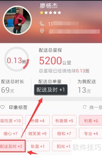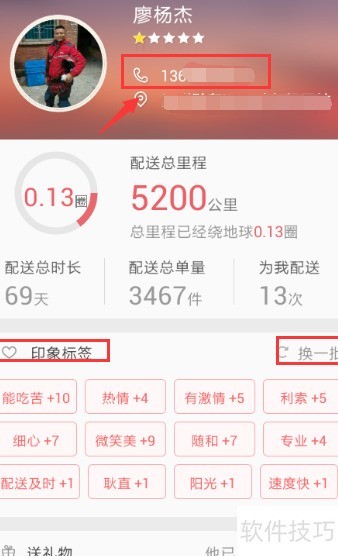 3、 打开配送员首页,可查看其手机信息与实时位置,同时显示配送总时长、累计单量及为您服务的次数。