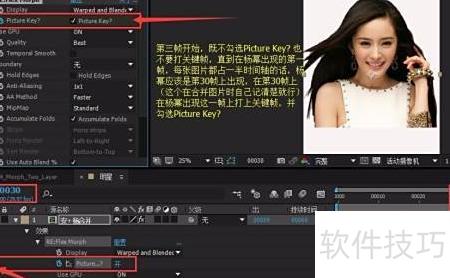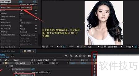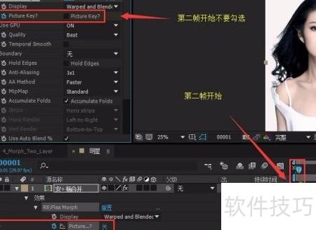 4、 合并后结合RE:Flex Morph特效,操作如下:在第一帧选中安以轩的图片,勾选Picture Key?并添加关键帧;从第二帧起取消该选项的勾选,同样插入关键帧,确保画面流畅过渡,实现理想的动态效果。