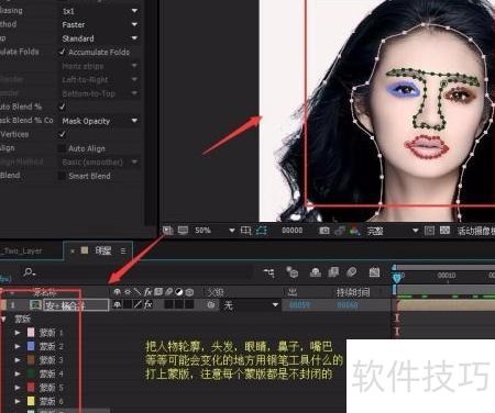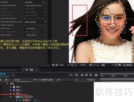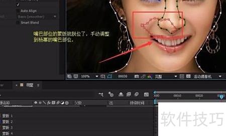 6、 从第一帧开始,可选用钢笔工具或其他顺手的工具,依照个人习惯为人物面部五官可能发生变动的区域逐一创建蒙版。注意蒙版路径无需闭合。在起始位置为每个蒙版路径添加关键帧。接着将时间轴移至出现杨幂并已勾选Picture Key?的那一帧,再次为所有蒙版路径设置关键帧。随后返回安以轩的第一帧,逐个调整其对应的蒙版形状,使其精准匹配杨幂面部各部位的位置与轮廓,确保过渡自然、贴合准确。