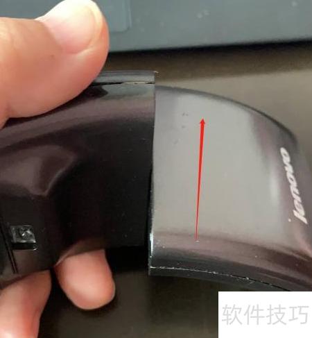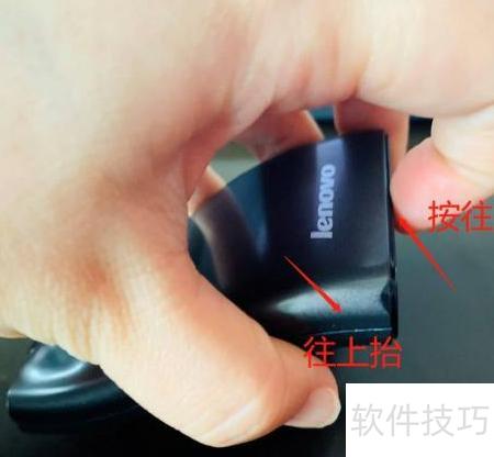 3、 一手按下底部按钮,另一手抬起logo处的塑料盖