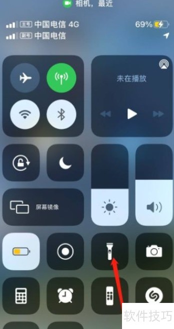 若苹果手机手电筒无法开启,可先启动相机应用测试闪光灯是否正常,随后进入控制中心,调出手电筒功能并把亮度滑至最高档位。