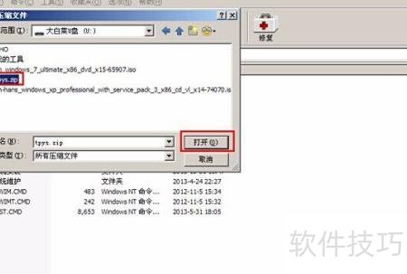 4、 在压缩文件浏览界面,选定目标文件后,点击打开即可开始解压操作。
