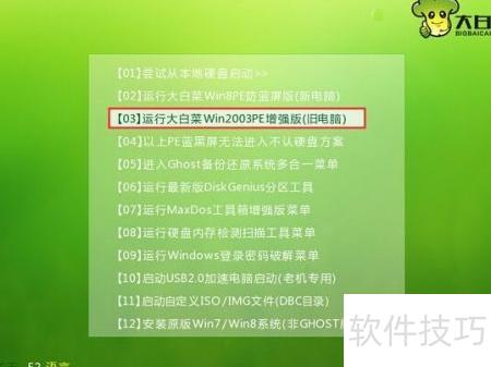 1、 将制作好的大白菜U盘插入USB接口,台式机用户建议连接机箱后置接口。重启电脑,在开机画面出现时,通过启动快捷键引导U盘,进入大白菜主菜单界面。使用方向键选择运行大白菜Win2003PE增强版(旧电脑)选项,按下回车键确认启动,即可进入PE系统进行后续操作。