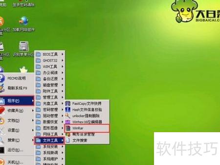 2、 登录大白菜PE系统桌面后,点击开始菜单,依次选择程序、文件工具,运行WinRar压缩解压软件。