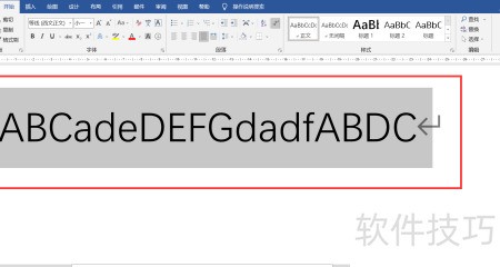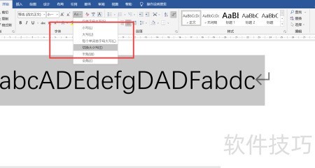 在Word文档中选中字符串,通过菜单栏的更改大小写功能,实现字母大小写的转换。