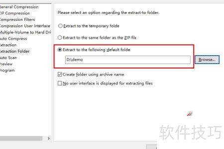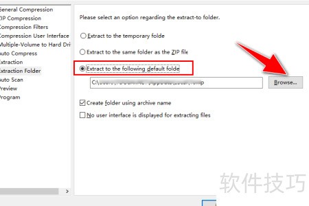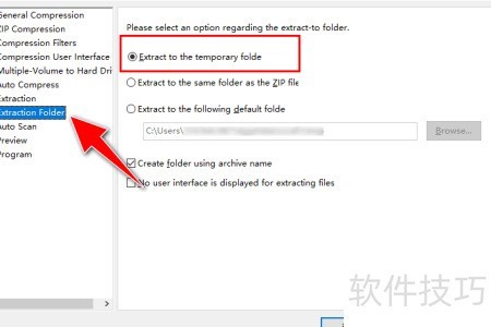 5、 在Extraction folder菜单中,系统默认选中Extract to the temporary folder选项,用户可据此进行文件解压路径的设置与调整。