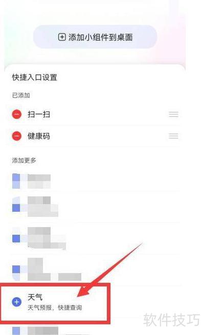 3、 进入快捷入口设置,在添加更多中找到天气,点击其前方的+号即可完成添加,操作所示。