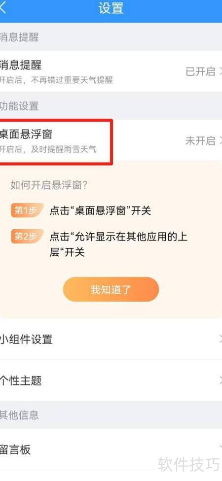 天气预报APP怎样开启桌面悬浮窗?具体操作步骤如下:进入设置,找到悬浮窗权限并开启即可。